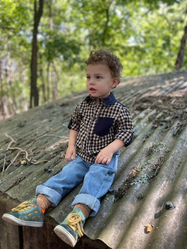 Het Bas hemd kan je volledig samenstellen hoe jij het wil. Heb je het liever volledig in eenzelfde stof of toch liever een contrasterende stof aan de mouwbiezen, de kraag en aan de bovenkant van de rug, zoals op de foto? Laat je volledig gaan. Aan de mouwen is er een biesje zodat de lange mouwen gemakkelijk opgerold kunnen worden.