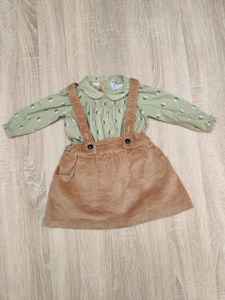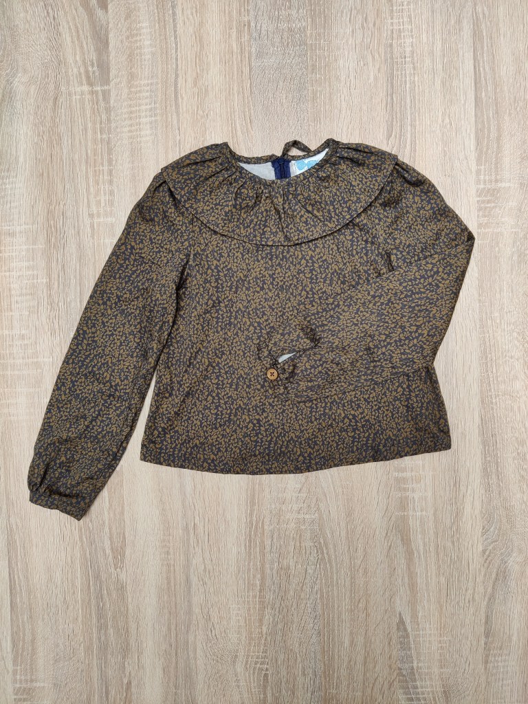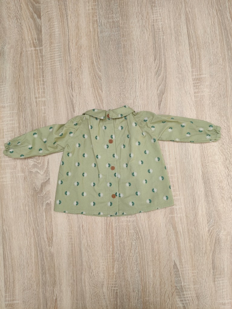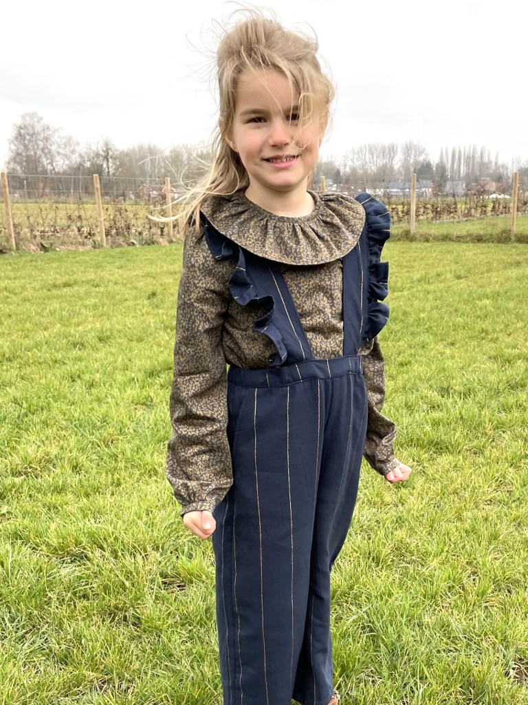 Deze mooie blouse valt los onderaan, heeft een mooi Peter Pan kraagje en 2 elastiekjes rond de polsen. De sluiting is met knoopjes op de rug. Combineert mooi met het Felix broekje, Gus salopette of met het Janne jurkje.