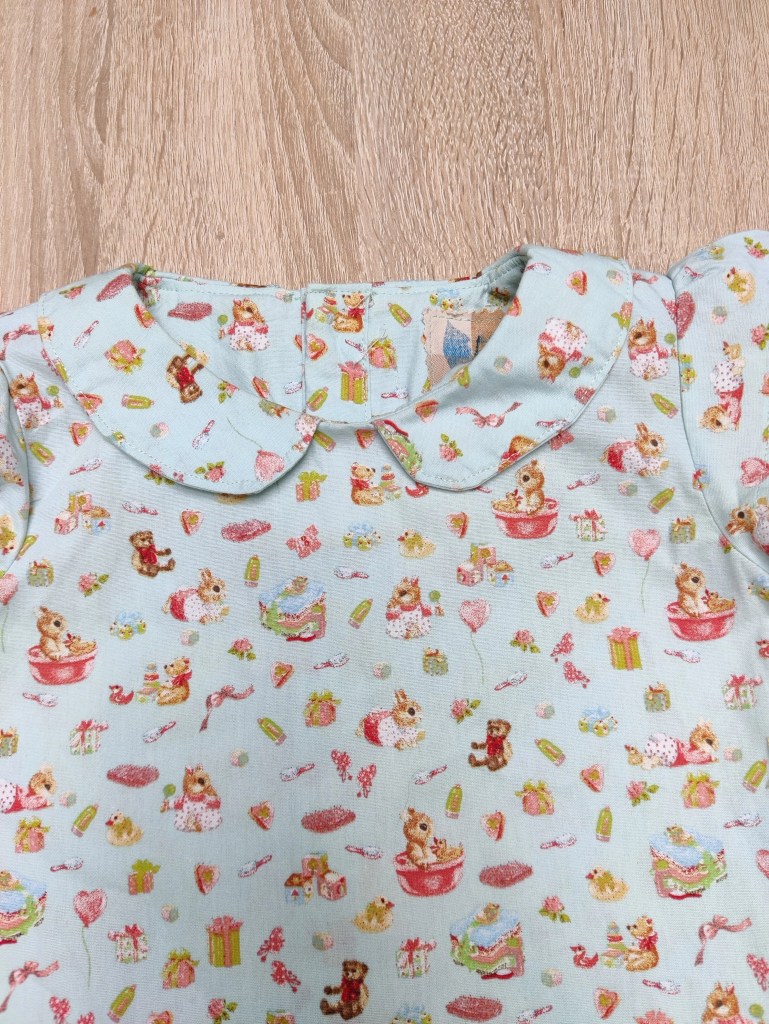 Ean A-lijn blouse met een mooi Peter Pan kraagje. De sluiting is met knoopjes op de rug. Combineert mooi met dit geel gebreide vestje, welke we ook in maat 68 beschikbaar hebben bij onze “pre-loved wondertjes” (Zie volgende foto’s).