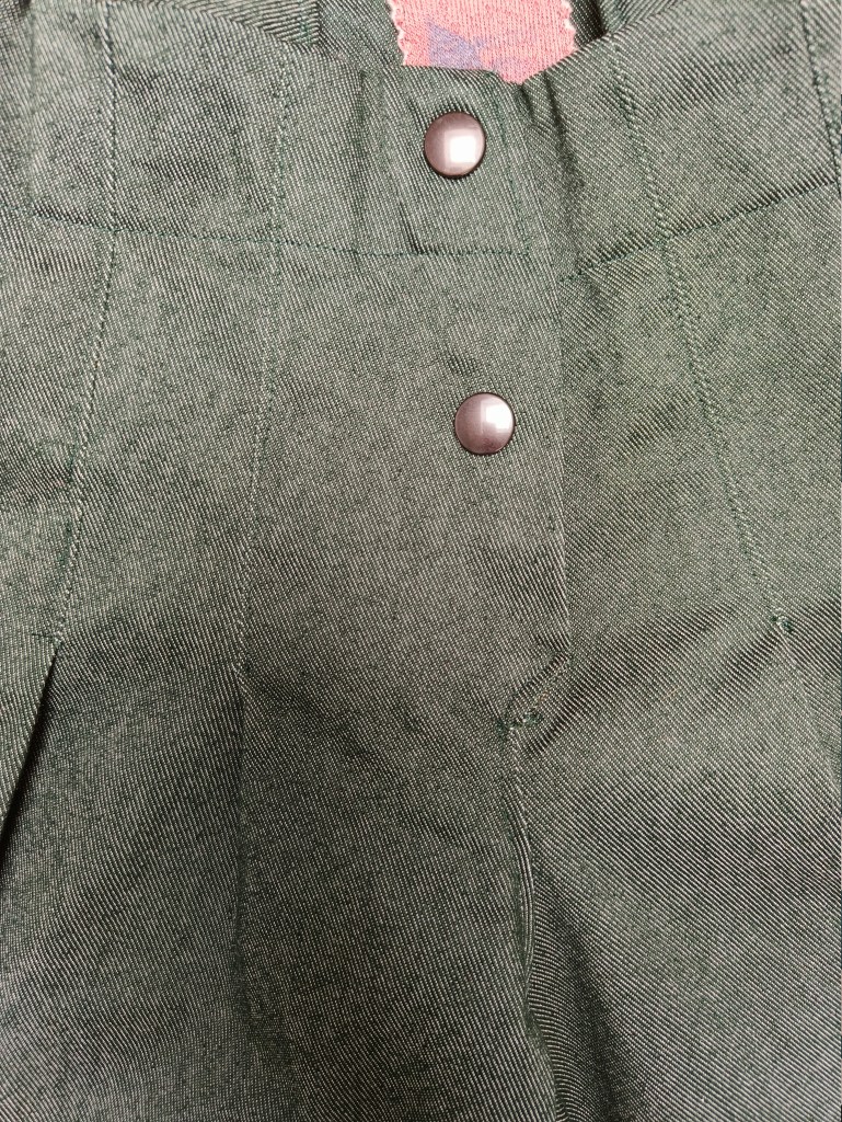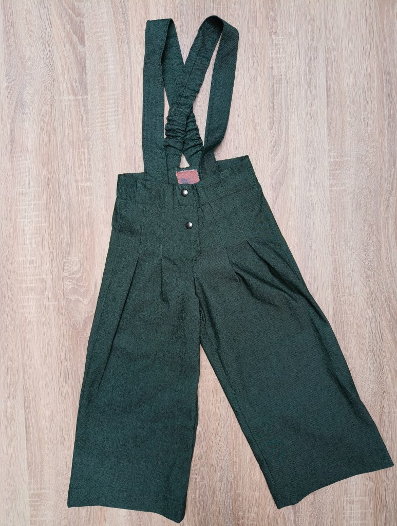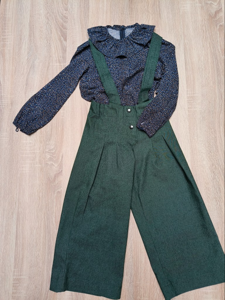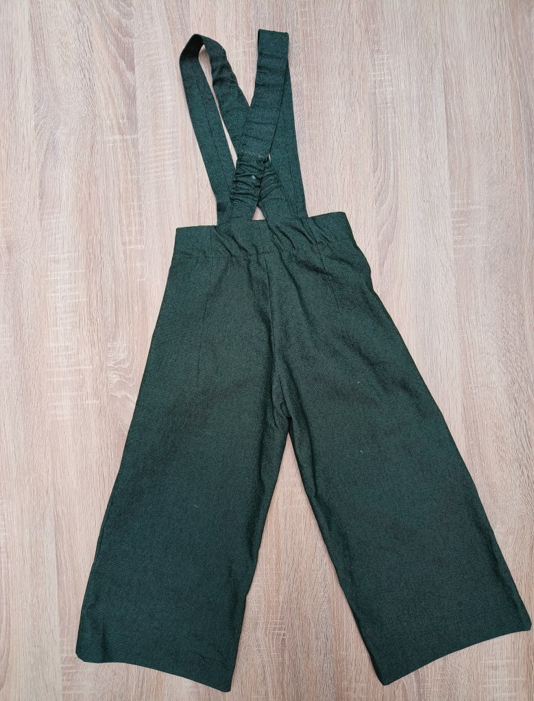 Groene broek met bretellen. Maat valt klein uit. Leuk te combineren met de Mona blouse op de laatste afbeelding. Deze is beschikbaar in maat 122/128.