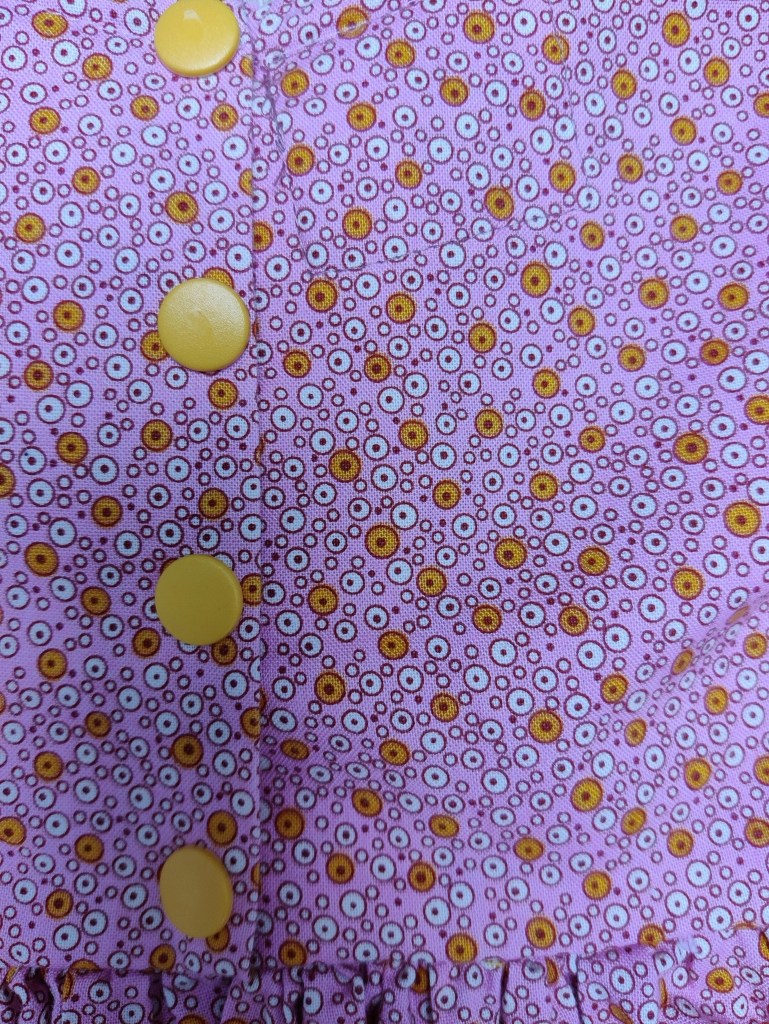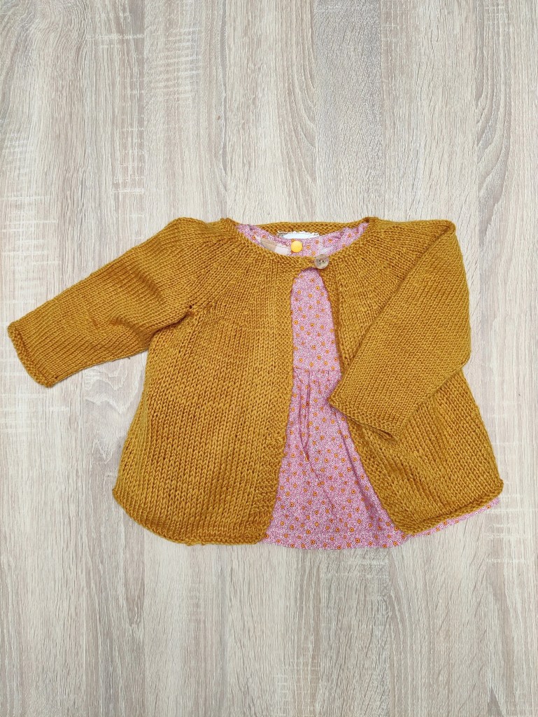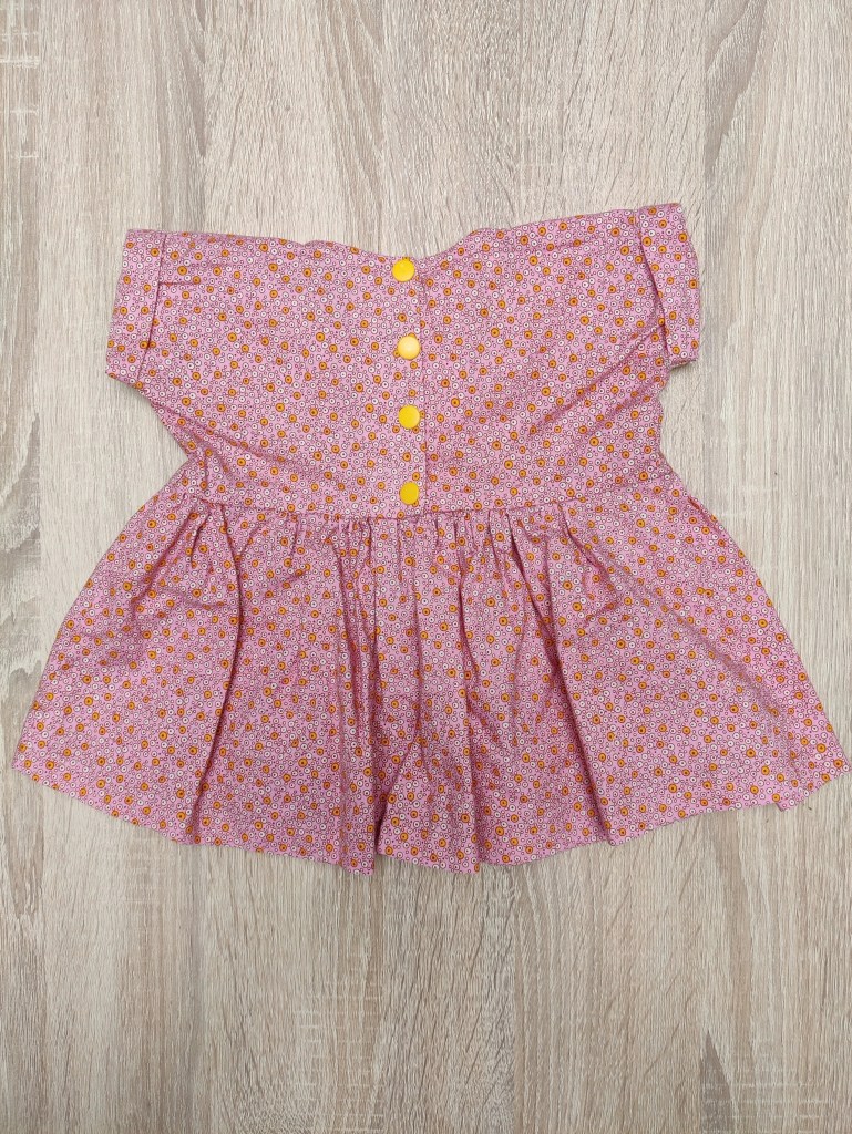 De sluiting is met drukknoopjes op de rug. Combineert mooi met dit geel gebreid vestje, welke we ook in maat 68 beschikbaar hebben bij onze “pre-loved wondertjes” (Zie volgende foto’s).